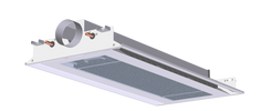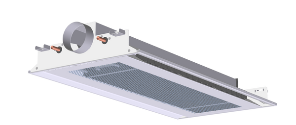 The supply air is supplied via nozzles that draw room air through the battery. Effective mixing of room air and supply air, i.e. induction, reduces the risk of draughts in the occupied zone. When Svalbard-I is to heat a room, the same technique is used to supply heat along the ceiling. The secondary air is sucked into the perforation on the underside of the baffle with the result that soiling of the roof is avoided.