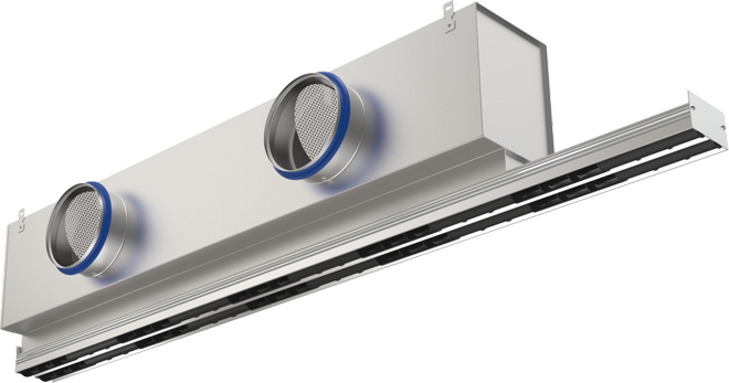 Den resulterende luftstrøm inducerer høje niveauer af rumluft, hvilket hurtigt reducerer luftstrømshastigheden og temperaturforskellen mellem indblæsningsluft og indendørs luft.